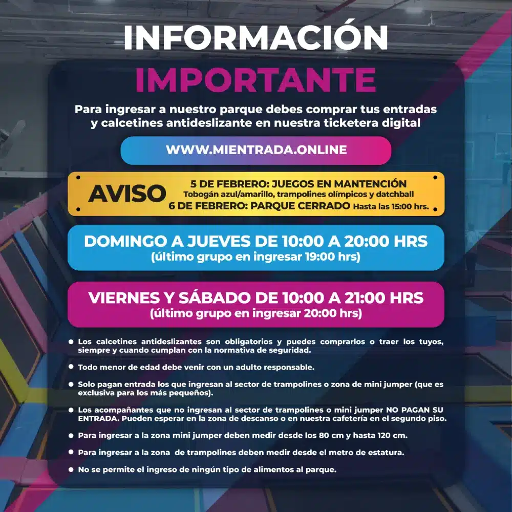 Para entrar a la zona mini jumper que es exclusiva para los más pequeños, deben medir como mínimo 80 cm hasta 120 cm. Y para los trampolines debe medir como mínimo 1 metro.